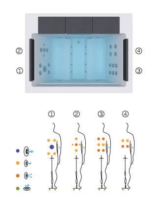 De 28 massagepunten (20 jets en 8 luchtinjectoren) zijn nauwkeurig vormgegeven en zo geplaatst dat men kan genieten van een ontspannende massage van de nek tot aan de onderrug, met luchtbelletjes die de bloedsomloop stimuleren vanaf de voeten tot aan de billen. De herstellende effecten zijn werkelijk verbazingwekkend.