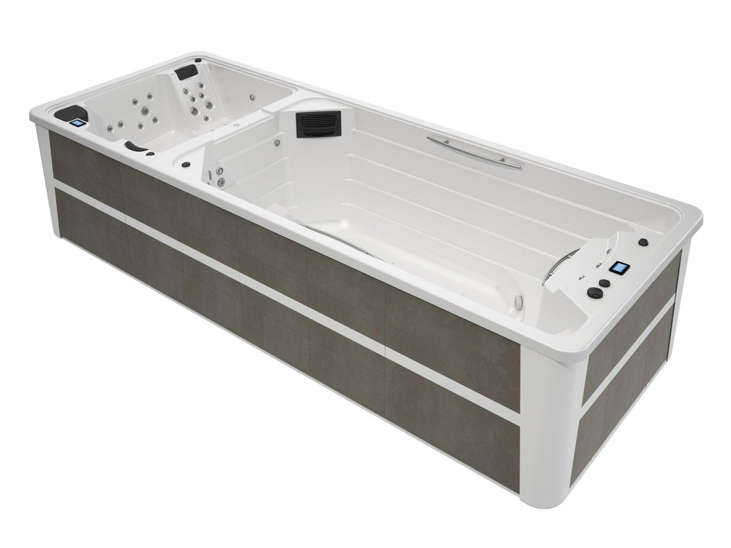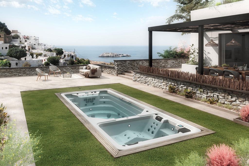 De 30 massagepunten met 3 standen in het hydromassagedeel zijn op verschillende manieren verdeeld tussen een ligstoel en twee zitplaatsen. Daarbij komen nog 12 punten die zijn gegroepeerd in een stand voor verticale massage in het zwembad. In deze zelfstandige kuip met gemakkelijke instap dankzij het trapje aan de binnenzijde, kunnen ook verschillende disciplines van aquafitness worden beoefend, van simpelweg tegen de stroom inlopen tot oefeningen met een volledige lijst eigen accessoires (onder meer een aquabike).